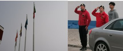 Concluída a apresentação do novo cadete, procedeu-se ao içar das bandeiras (Nacional, CEE, Junta de Freguesia de Pinhal Novo e das bandeiras da Associação e dos Bombeiros do Sul e Sueste do Barreiro) nos mastros que se encontram na zona frontal do quartel sede. (O instrutor subchefe Tiago Silva)