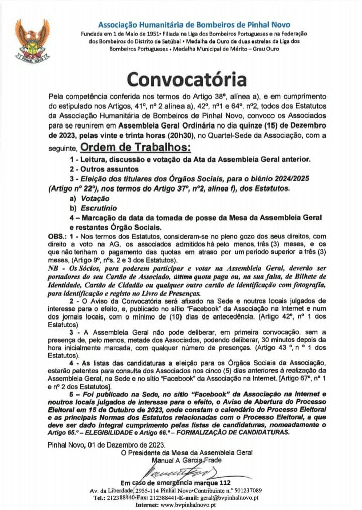 Haverá nessa AG Eleições para os Órgãos Sociais para o biénio de 2024-2025.
