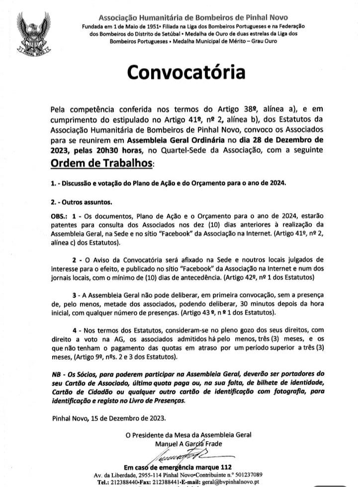 Os sócios dos Bombeiros de Pinhal Novo encontram-se convocados para reunir em Assembleia Geral, no próximo dia 28 dezembro de 2023 – Quinta-feira, pelas 20:30 horas, no Quartel-Sede da Associação, a fim de discutir e votar o Plano de Ação e Orçamento para 2024