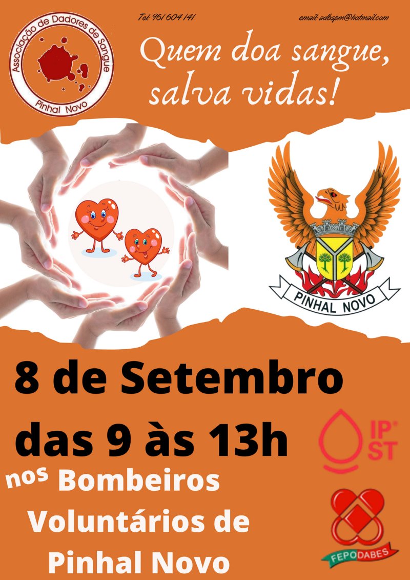 No próximo dia 8 de Setembro, entre as 9h00 e as 13h00, a Associação de Dadores de Sangue de Pinhal Novo promove uma colheita de sangue, nos Bombeiros Voluntários de Pinhal Novo.
